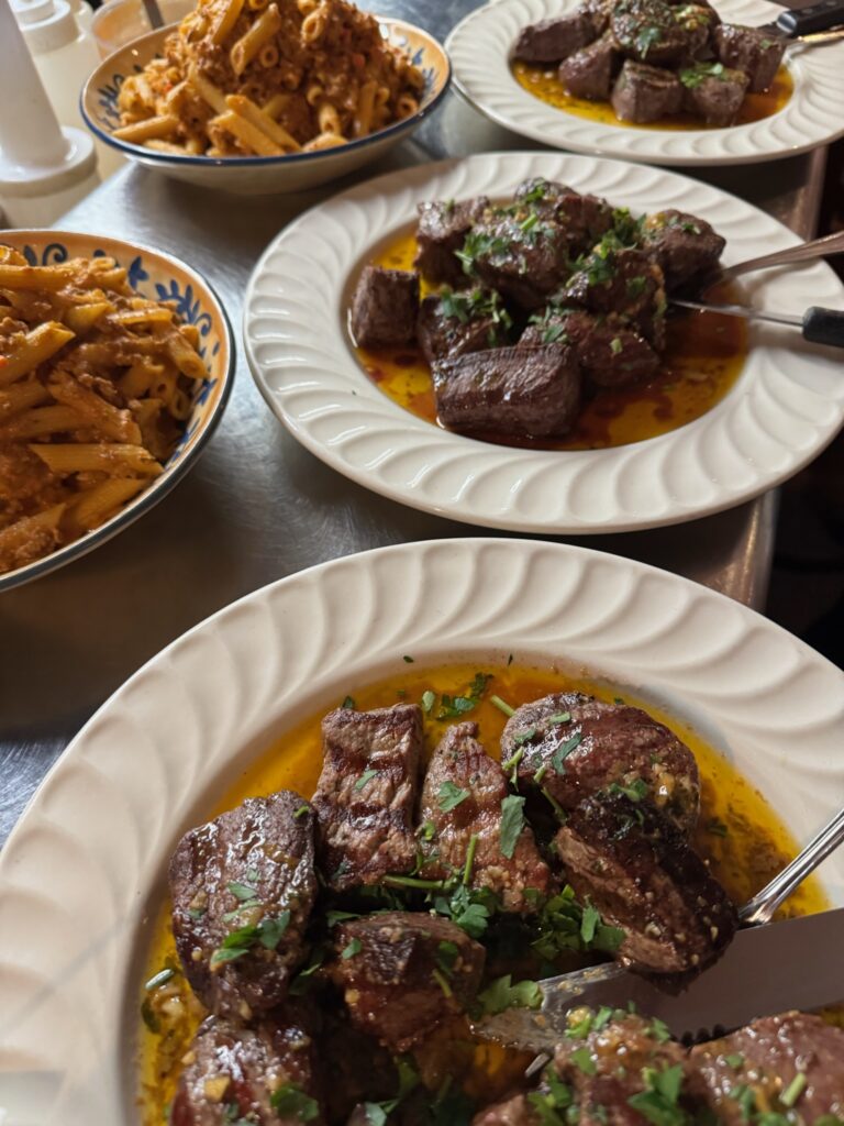 Family style. Large platters are served to each table, allowing guests to share and savor together. This approach ensures more quality time spent with each other, without the need to browse menus or place individual orders.