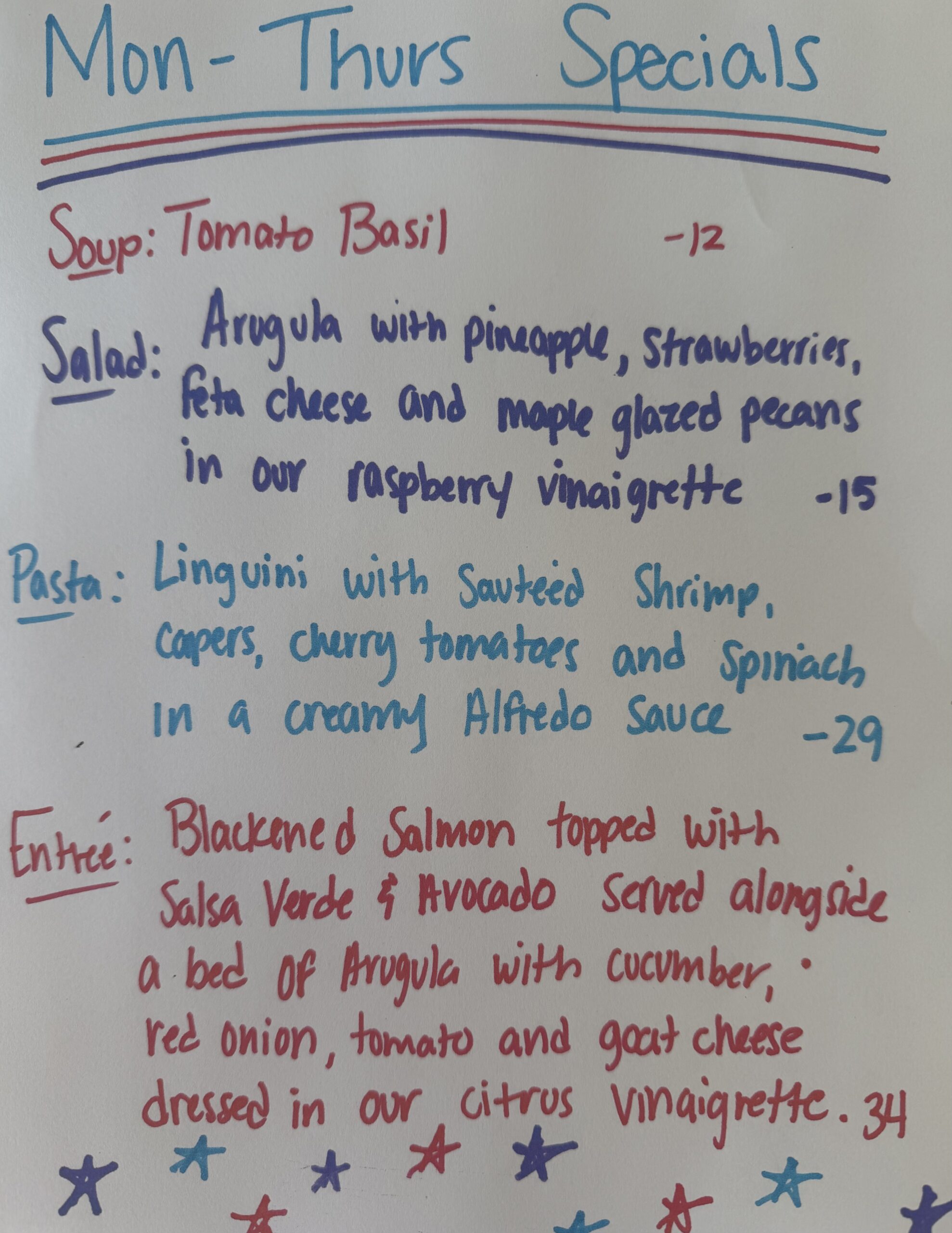 Home ยป Specials Loading... X Specials Click to Order Our entire menu and specials are available for togo. Place your order as early as 4:00 and choose your pick-up time.